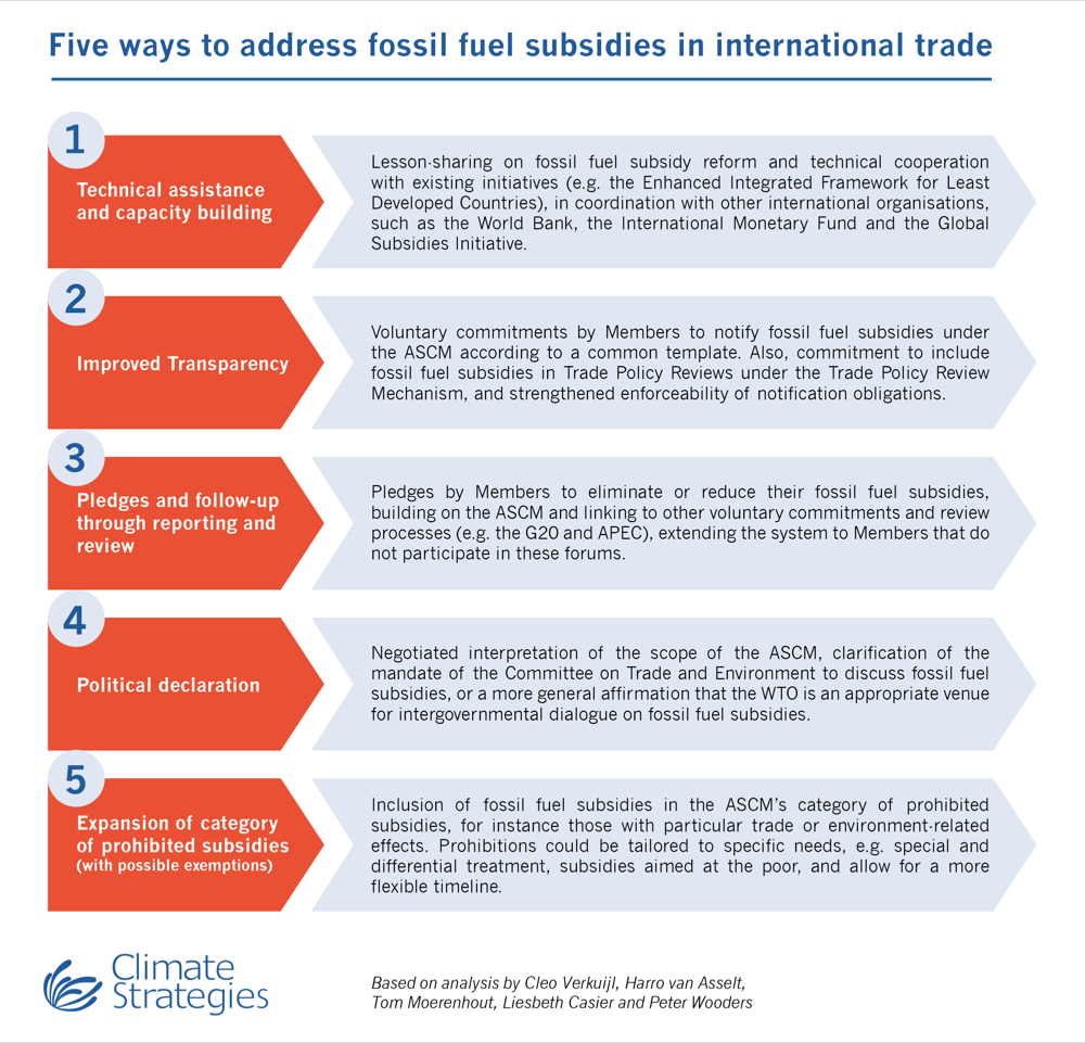 - WTO Members have several options to address fossil fuel subsidies, including: providing technical assistance and capacity building; improving transparency; making reform pledges; adopting a political declaration; and including fossil fuel subsidies in the WTO’s list of prohibited subsidies.