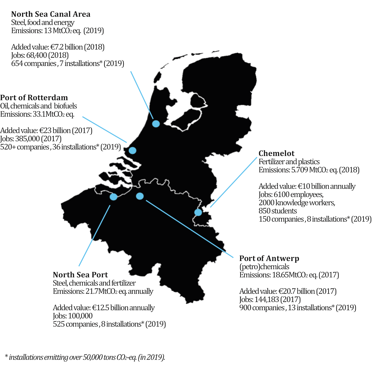 In a policy brief, we investigated the governance of five clusters in the Netherlands and Belgium. The clusters are located in the industrial region spanning Antwerp, Rotterdam, and the Ruhr and Rhine river regions (often called ARRRA), and are connected through a highly developed pipeline infrastructure, transporting key feedstocks and energy carriers such as hydrogen, ethylene and propylene. Some characteristics of the clusters are summarised in the figure.